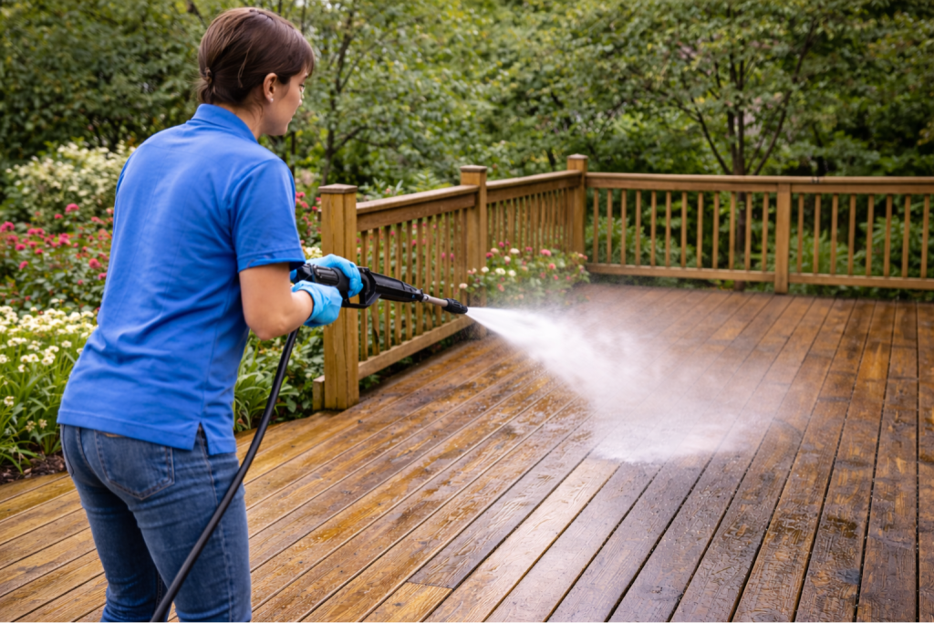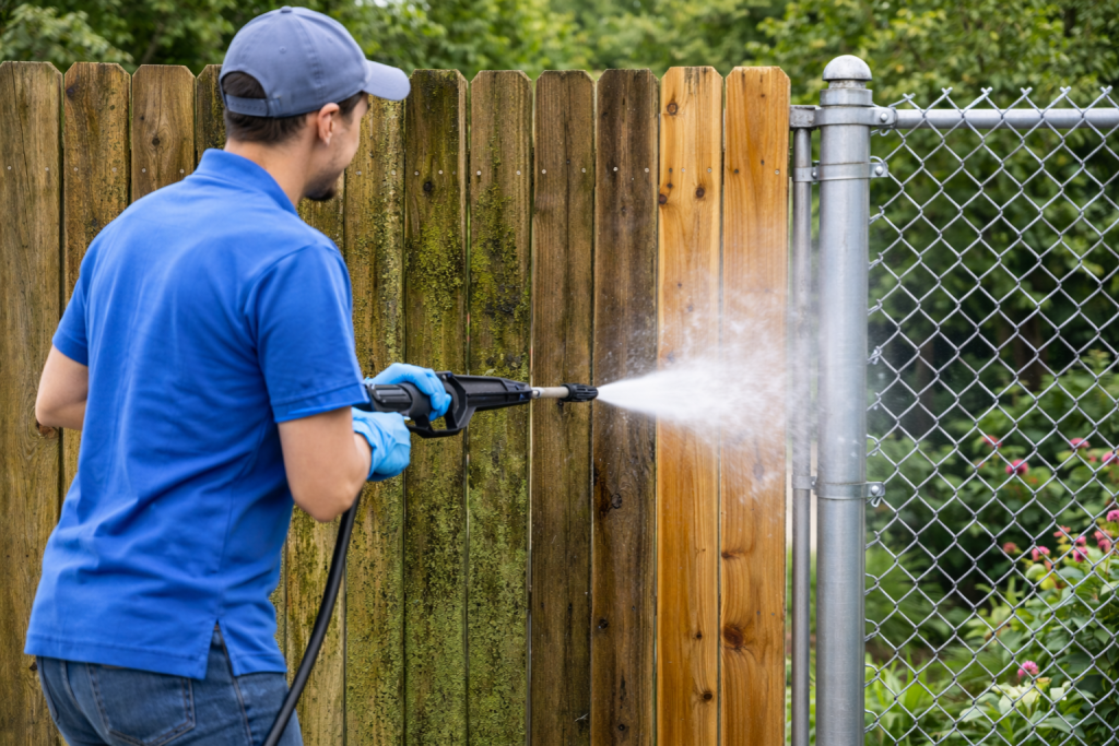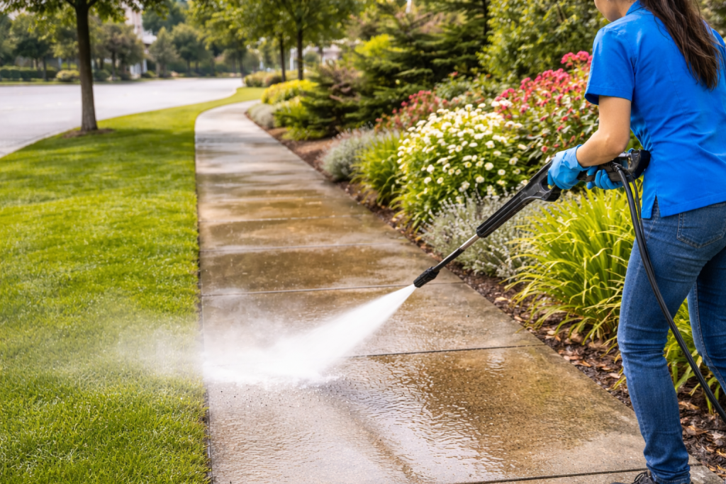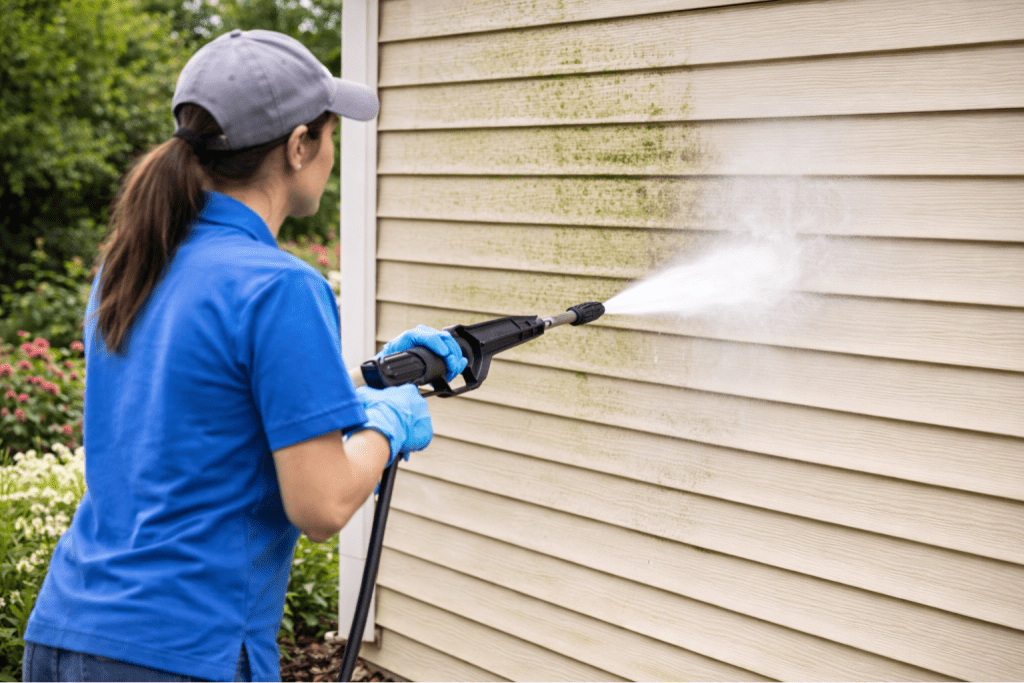 Exterior cleaning services for residential prioerties using high-pressure water.